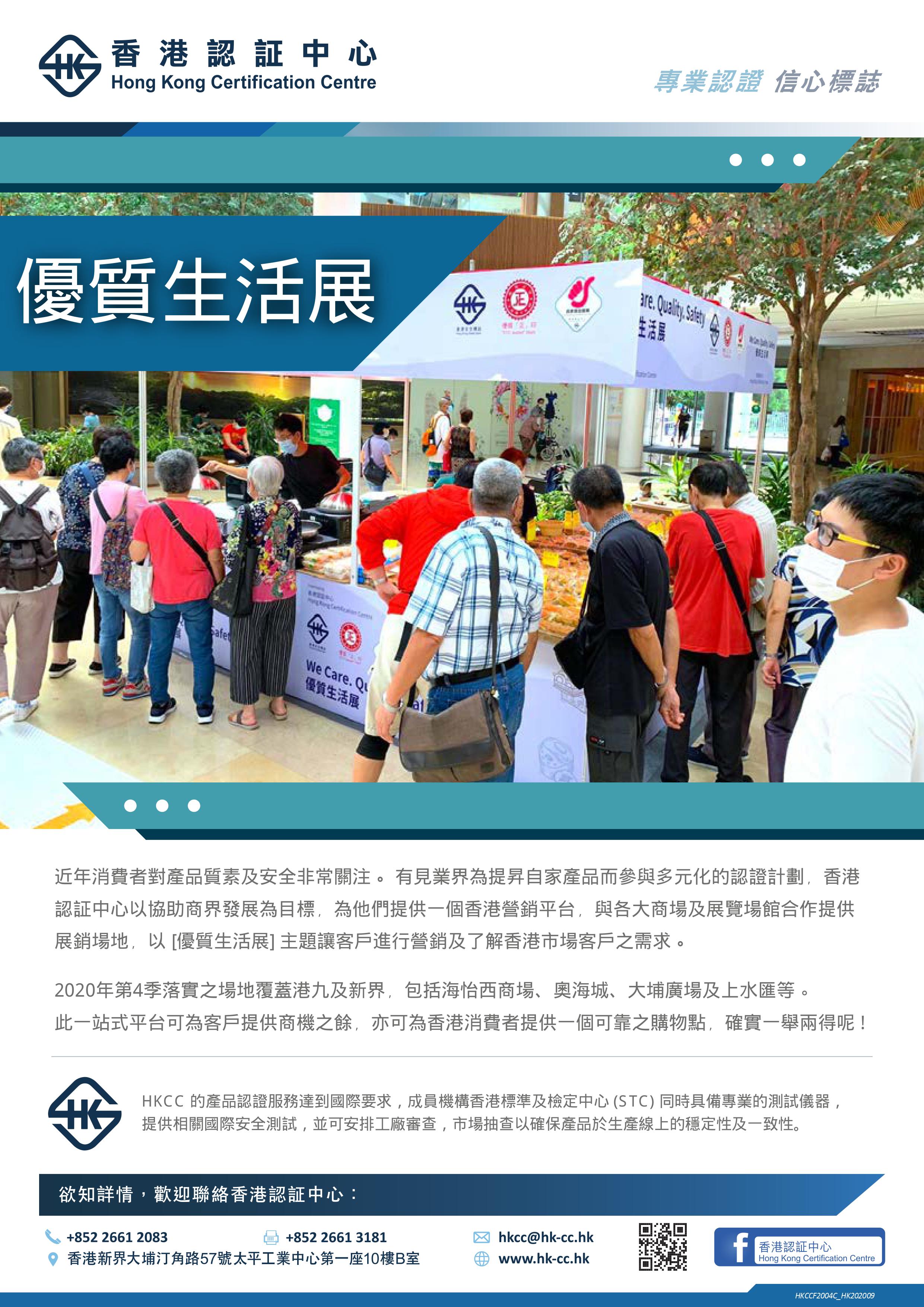 近年消費者對產品質素及安全非常關注。 有見業界為提昇自家產品而參與多元化的認證計劃﹐香港 認証中心以協助商界發展為目標﹐為他們提供一個香港營銷平台﹐與各大商場及展覽場館合作提供 展銷場地﹐以 [優質生活展] 主題讓客戶進行營銷及了解香港市場客戶之需求。 2020年第4季落實之場地覆蓋港九及新界﹐包括海怡西商場﹑奧海城﹑大埔廣場及上水匯等。 此一站式平台可為客戶提供商機之餘﹐亦可為香港消費者提供一個可靠之購物點﹐確實一舉兩得呢 !