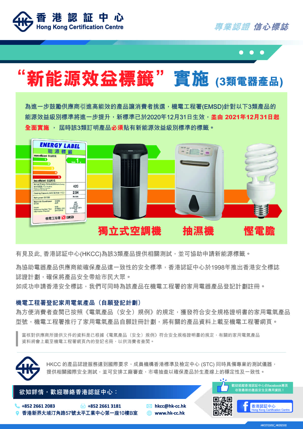 為進一步鼓勵供應商引進高能效的產品讓消費者挑選,機電工程署(EMSD)針對以下3類產品的能源效益級別標準將進一步提升,新標準已於2020年12月31日生效,並由 2021年12月31日起全面實施 , 屆時該3類訂明產品須貼有新能源效益級別標準的標籤。